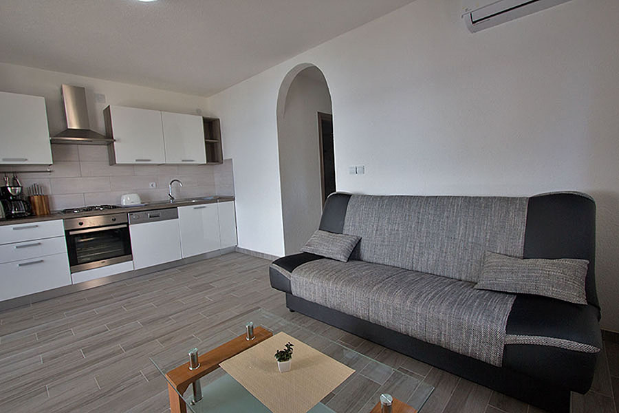 - Wohnzimmer mit ausziehbarer Doppelcouch für 2 Personen und SAT-TV.